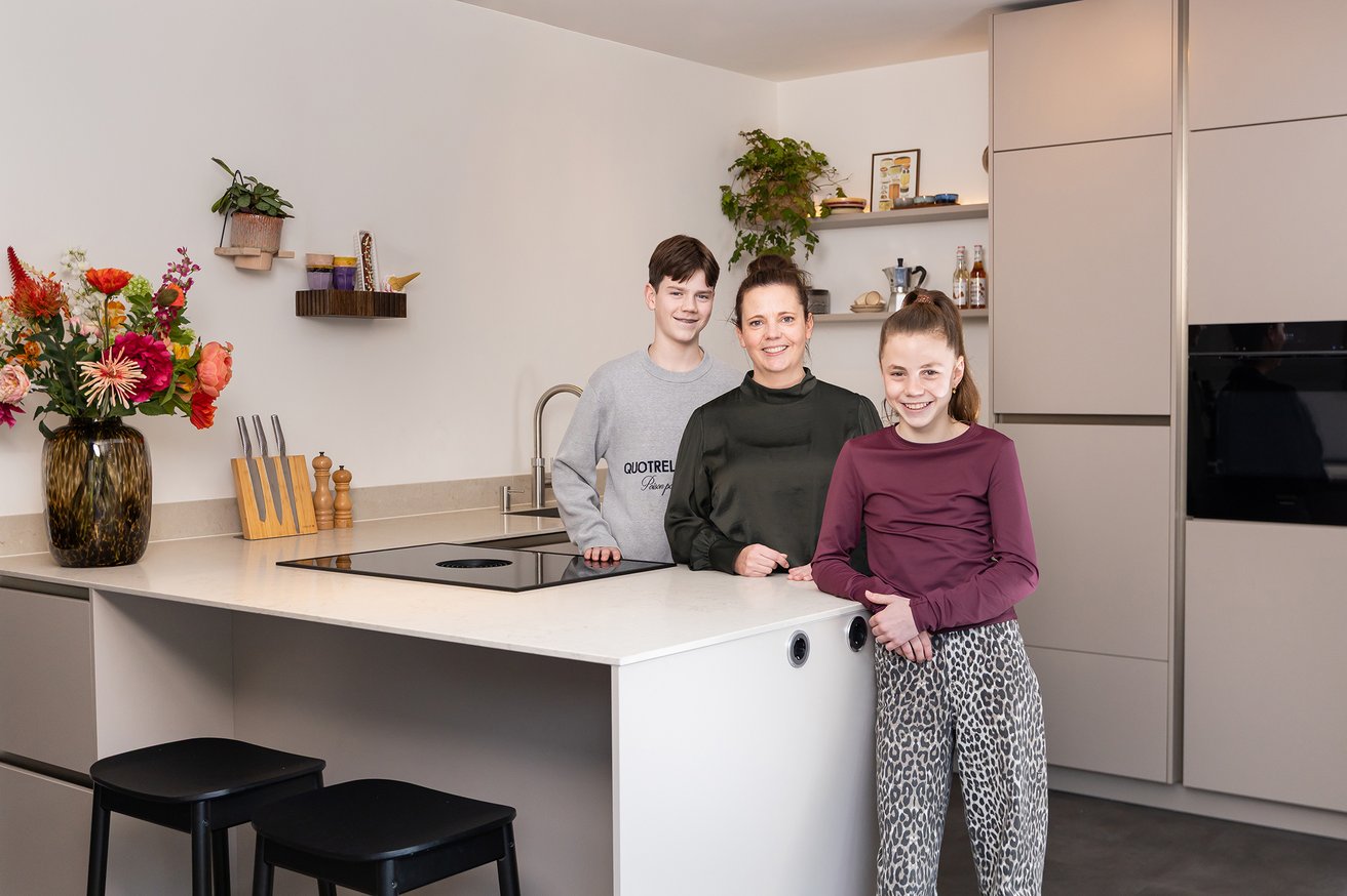 De familie had duidelijke ideeën voor hun nieuwe keuken. “Een barretje stond bovenaan onze wensenlijst, zodat we er met z’n tweeën of met de kinderen gezellig kunnen zitten,” vertelt Marieke. “Daarnaast wilden we graag veel opbergruimte met hoge kasten, een grote koelkast, een oven waar twee pizza’s in passen én een BORA kookplaat.” En dat alles is gerealiseerd. “De keuken past perfect bij ons huis én ons gezin,” aldus Marieke.